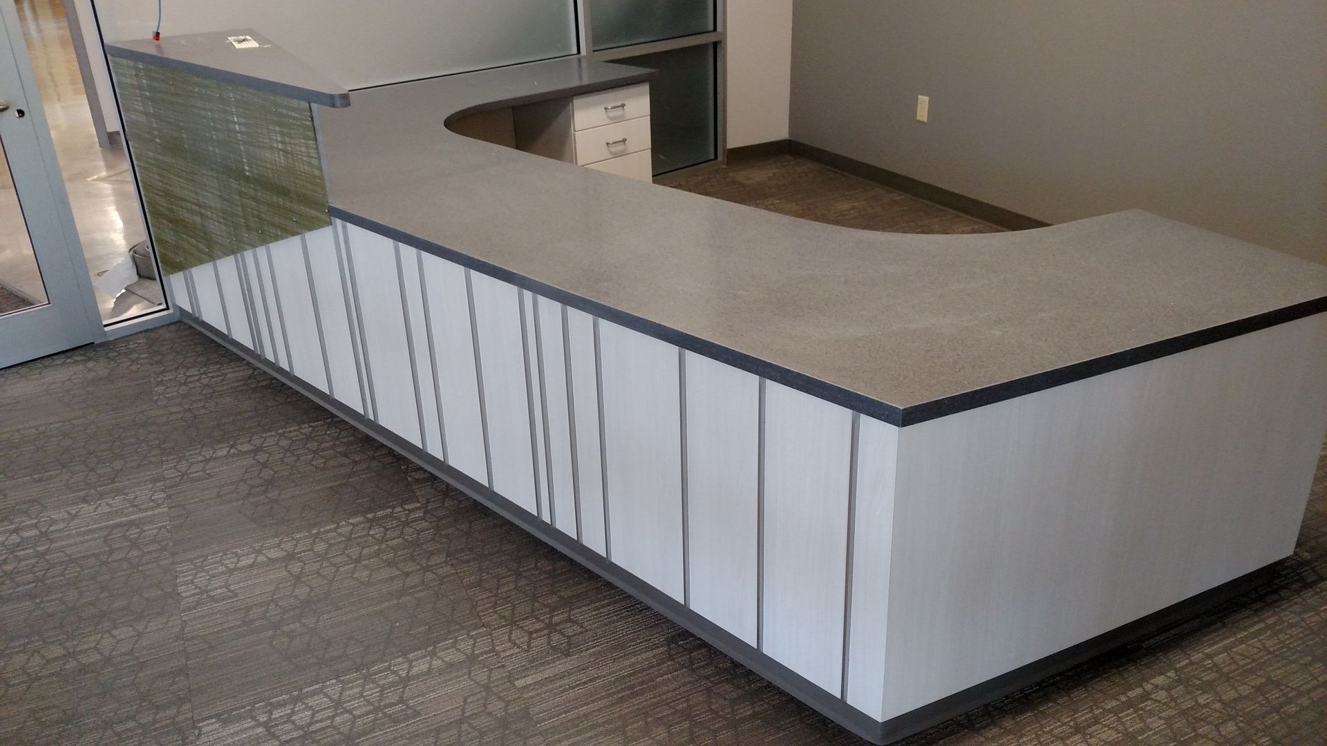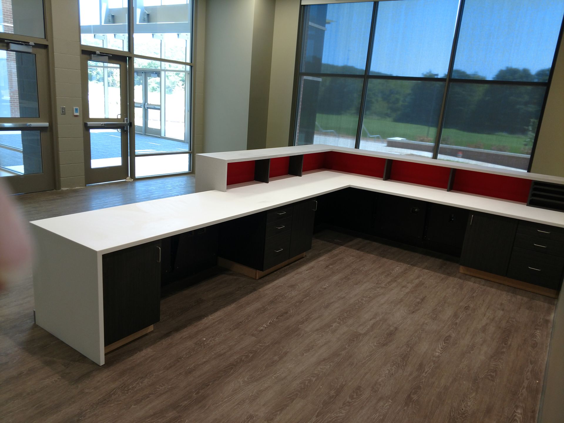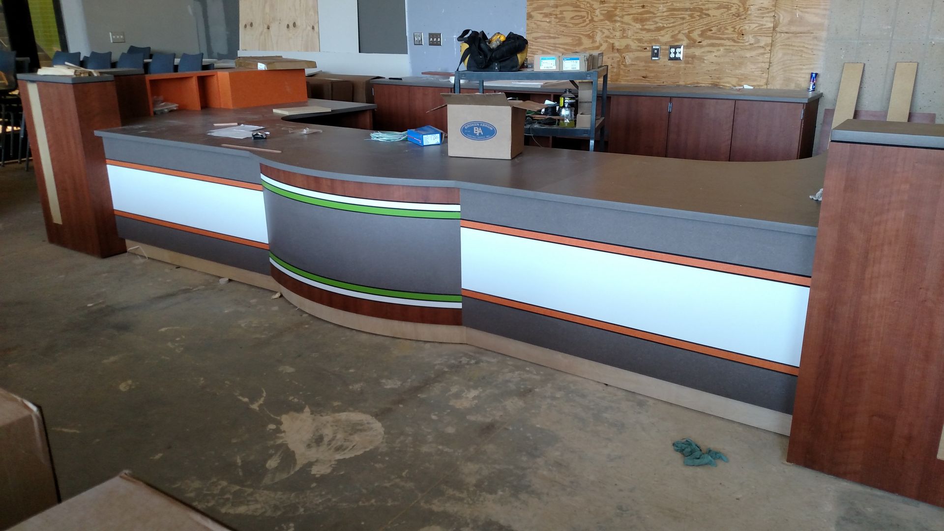 This custom reception area was designed to make a bold first impression. Featuring clean lines, high-quality materials, and seamless integration of branding elements, it reflects the company’s professional identity while maintaining functionality and durability for high-traffic use.